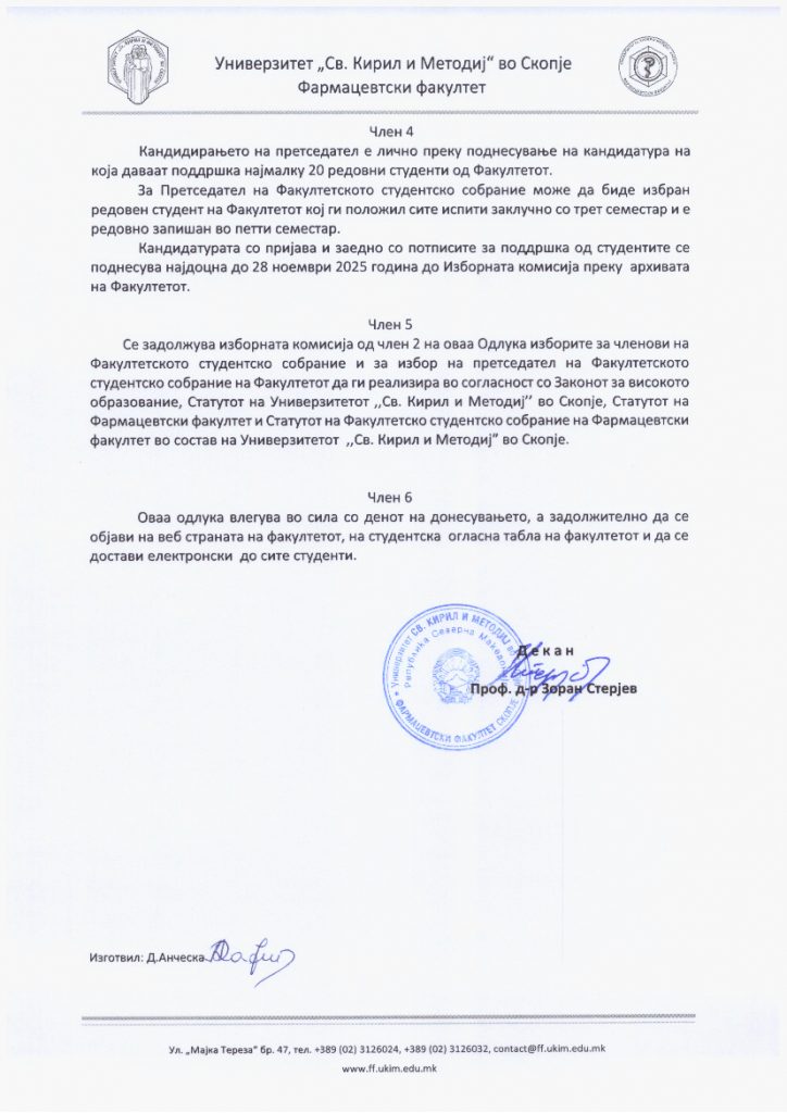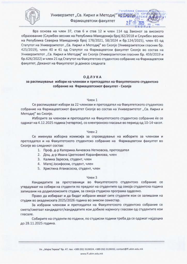 Одлука за распишување избори на членови и претседател на Факултетското студентско собрание на Фармацевтски факултет Скопје admin 20/11/2025 Студенти Навигација на напис Previous Previous post: Резултати од првиот колоквиум по предметот Општа и неорганска хемија (студ. програма Лабораториско биоинжинерство 2025-2026) одржан на 17.11.2025