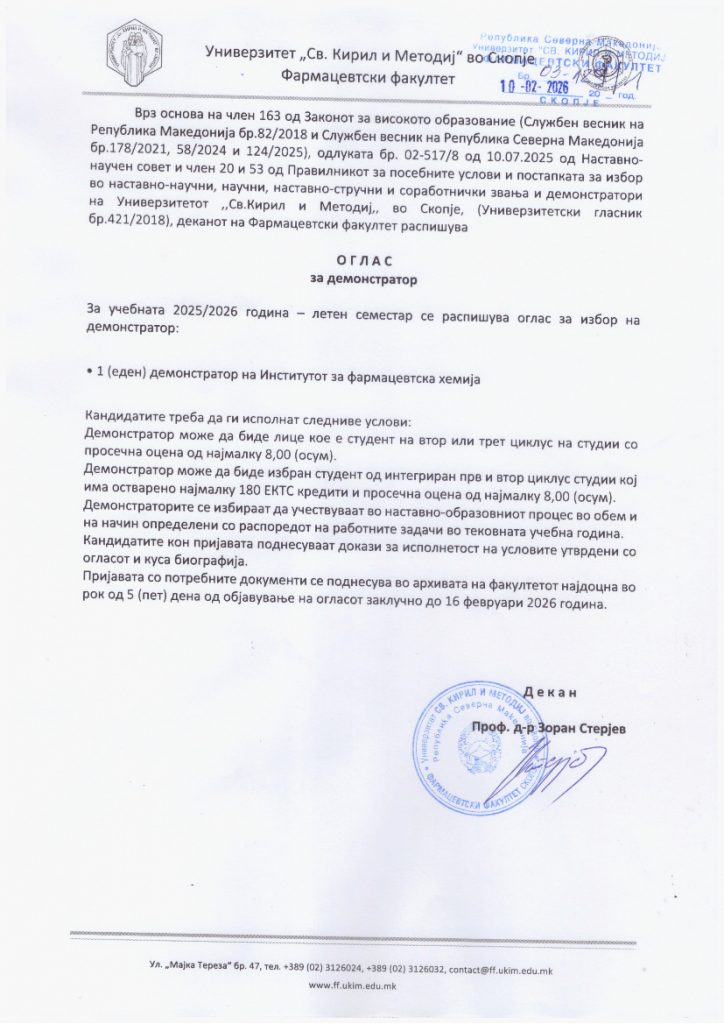 Врз основа на член 163 од Законот за високото образование (Службен весник на Република Македонија бр.82/2018 и Службен весник на Република Северна Македонија бр.178/2021, 58/2024 и 124/2025), одлуката бр. 02-517/8 од 10.07.2025 од Наставно-научен совет и член 20 и 53 од Правилникот за посебните услови и постапката за избор во наставно-научни, научни, наставно-стручни и соработнички звања и демонстратори на Универзитетот ,,Св.Кирил и Методиј,, во Скопје, (Универзитетски гласник бр.421/2018), деканот на Фармацевтски факултет распишува