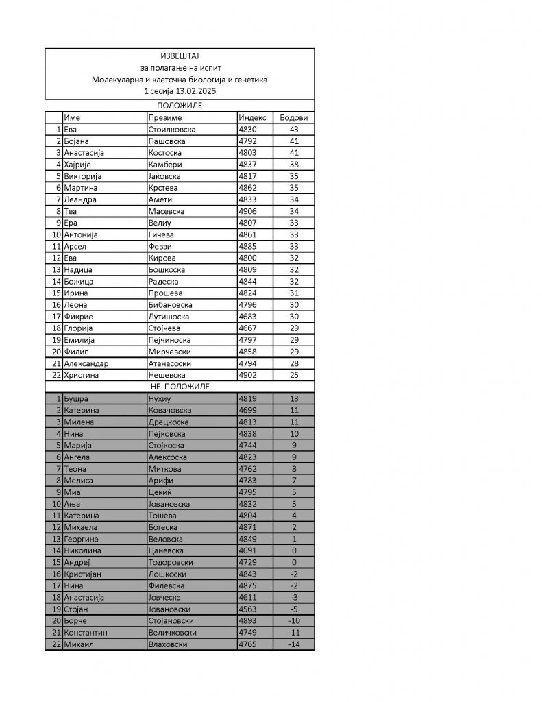 Извештај за полагање на испит Молекуларна и клеточна биологија и генетика1 сесија 13.02.2026 admin 17/02/2026 Студенти Од Катедра Навигација на напис Previous Previous post: Прво предавање ФармакоинформатикаNext Next post: Известување за потписи и оцени од Институт за применета биохемија