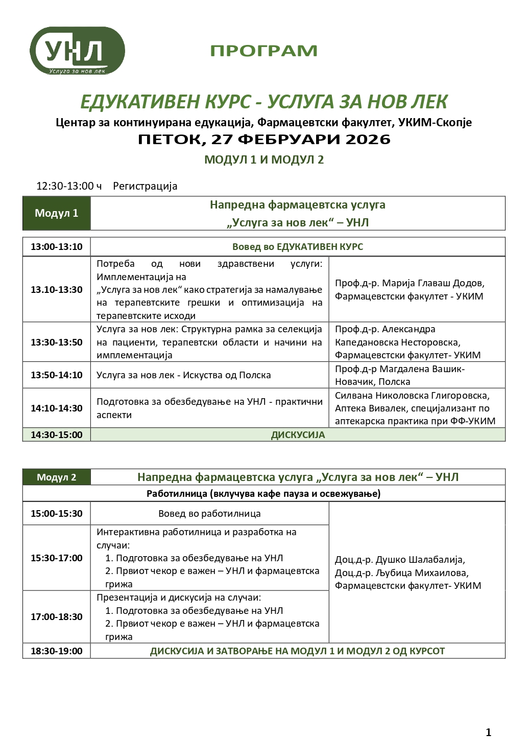 Центарот за континуирана едукација при Фармацевтскиот факултет, УКИМ – Скопје ги поканува сите заинтересирани фармацевти да се пријават на напредниот едукативен курс посветен на фармацевтската услуга „Услуга за нов лек (УНЛ)” — структурирана клиничко-фармацевтска интервенција насочена кон поддршка на пациентите при започнување нова терапија.